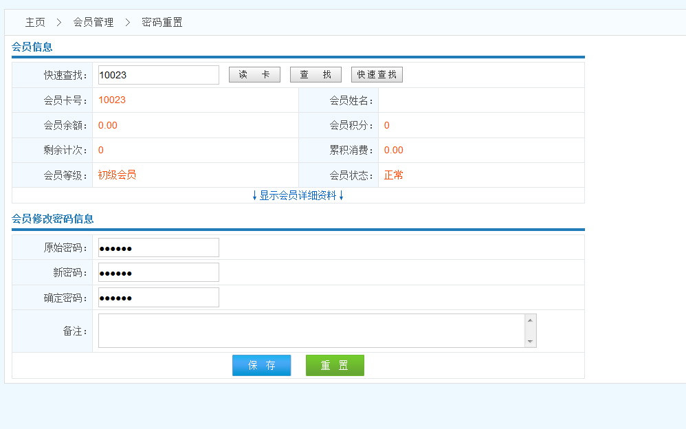 操作流程: 查找會(huì)員------>驗(yàn)證密碼(根據(jù)系統(tǒng)參數(shù)設(shè)置 選填)------>錄入新密碼------>保存------>密碼重置成功