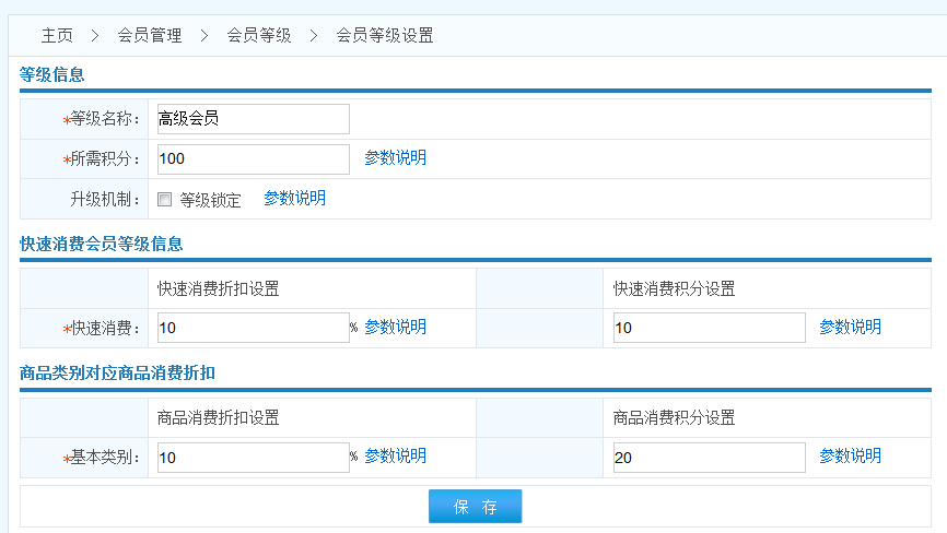 升級機制:啟用等級鎖定則此會員等級不受自動升級機制影響,保持等級不變 適用于 只積分不打折 類型會員等級