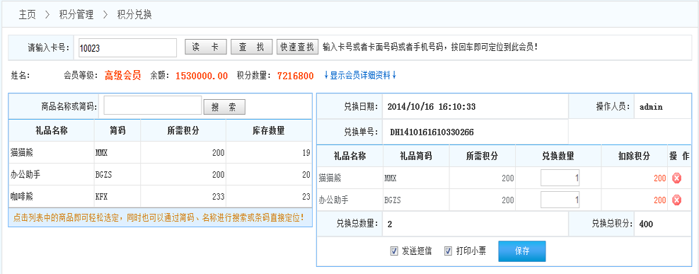 1.發(fā)送短信:如果系統(tǒng)開啟了短信功能,在完成兌換后系統(tǒng)會(huì)自動(dòng)給該會(huì)員發(fā)送通知短信,告知會(huì)員兌換信息!(開啟短信功能在 增值服務(wù)》服務(wù)參數(shù)》短信參數(shù)設(shè)置(對(duì)短信進(jìn)行參數(shù)設(shè)置))