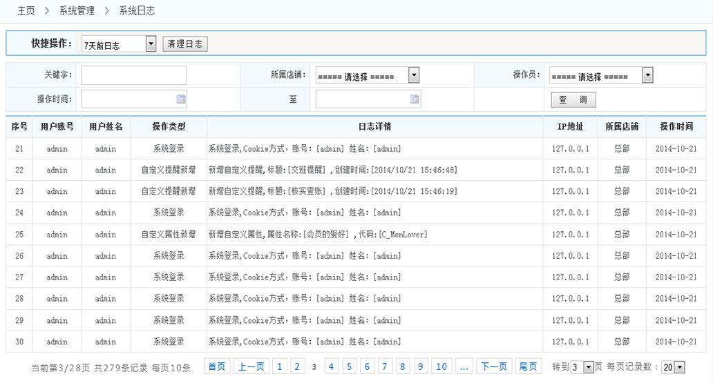 2.查詢?nèi)罩荆焊鶕?jù)條件查詢數(shù)據(jù)(關(guān)鍵詞、時(shí)間段、按店鋪、按操作員)