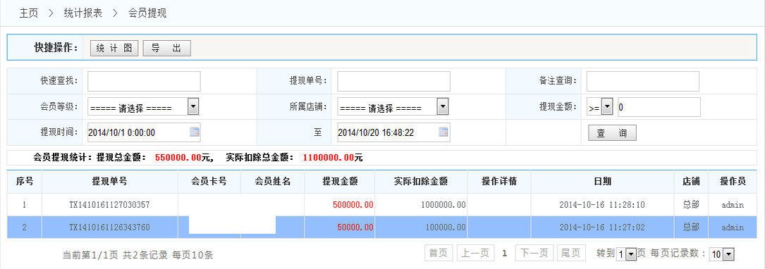 3.會員提現(xiàn)統(tǒng)計:將統(tǒng)計在滿足設(shè)定的條件下的所有提現(xiàn)的概況