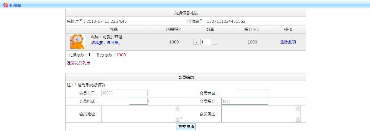 點(diǎn)擊兌換禮品添加到購(gòu)物車內(nèi) 點(diǎn)擊購(gòu)物車1件 跳轉(zhuǎn)到兌換信息禮品頁(yè)面,填寫會(huì)員的地址會(huì)員備注信息提交兌換禮品申請(qǐng)!