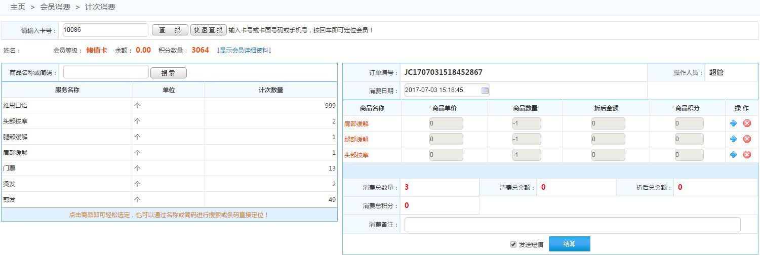 通過刷卡,或者通過查詢定位到會(huì)員,然后在左側(cè)選擇服務(wù)類型商品進(jìn)行計(jì)次消費(fèi) 如下圖: